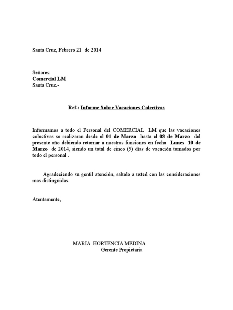 Modelo De Carta De Vacaciones Colectivas